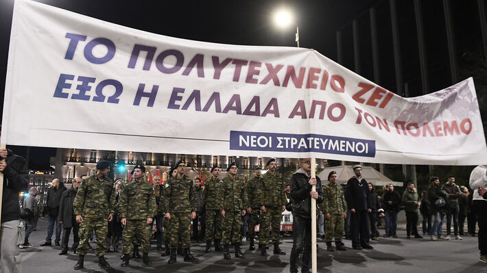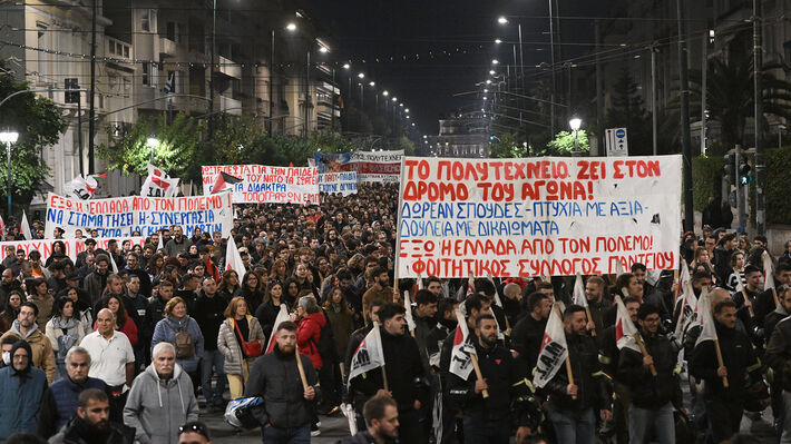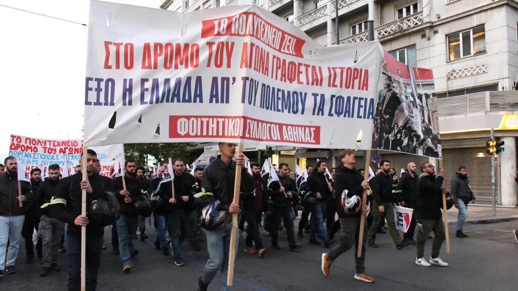 Χιλιάδες άνθρωποι με κεντρικά συνθήματα “Το Πολυτεχνείο ζει σε αγώνες μας καλεί” και “Λευτεριά στην Παλαιστίνη”, «Το Πολυτεχνείο ζει, έξω οι Αμερικανοί», «Ούτε γη, ούτε νερό, στους φονιάδες των λαών», «Φονιάδες των λαών Αμερικάνοι» πορεύτηκαν σε μια τεράστια σε όγκο και παλμό διαδήλωση.