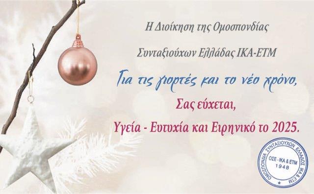 ΑνακοινώσειςΛοιπών Ευχές από την Ομοσπονδία Συνταξιούχων ΙΚΑ και Επικουρικών Ταμείων Μισθωτών Date: 19/12/2024 Ευχές από την Ομοσπονδία Συνταξιούχων ΙΚΑ και Επικουρικών Ταμείων Μισθωτών TagsΕΥΧΕΣΟΜΟΣΠΟΝΔΙΑ ΣΥΝΤΑΞΙΟΥΧΩΝ ΙΚΑΠΡΩΤΟΧΡΟΝΙΑΧΡΙΣΤΟΥΓΕΝΝΑ Προηγούμενο άρθροΕυχές από την Ένωση Συνταξιούχων Εμπόρων Αθηνών-Πειραιώς-ΠεριχώρωνΕπόμενο άρθροΕυχές από τον Πανελλήνιο Σύλλογο Συνταξιούχων Τηλεπικοινωνιών Ομίλου Ο.Τ.Ε. share post FacebookTwitterPinterestWhatsApp Δημοφιλέστερα Δωρεάν είσοδος σε μουσεία και αρχαιολογικούς χώρους το Σάββατο 18 Απριλίου e-ΕΦΚΑ: Προσωρινή διακοπή ηλεκτρονικών υπηρεσιών ασφάλισης Ημερομηνίες πληρωμής των συντάξεων μηνός Μαΐου 2026 Τρένο συγκρούστηκε με αγριογούρουνο στη γραμμή Λάρισα – Θεσσαλονίκη Η «ΕΝΟΤΗΤΑ σας εύχεται ΚΑΛΟ ΠΑΣΧΑ Και άλλα σαν αυτόΣχετικα Δωρεάν είσοδος σε μουσεία και αρχαιολογικούς χώρους το Σάββατο 18 Απριλίου epress - 15/04/2026 Δωρεάν θα είναι η είσοδος σε αρχαιολογικούς χώρους, μουσεία... e-ΕΦΚΑ: Προσωρινή διακοπή ηλεκτρονικών υπηρεσιών ασφάλισης epress - 14/04/2026 Με ανακοίνωση της η Διοίκηση του e-ΕΦΚΑ ενημέρωσε πως... Ημερομηνίες πληρωμής των συντάξεων μηνός Μαΐου 2026 Enotita - 13/04/2026 Ημερομηνίες πληρωμής των συντάξεων μηνός Μαΐου 2026 Οι ημερομηνίες πληρωμής... Τρένο συγκρούστηκε με αγριογούρουνο στη γραμμή Λάρισα – Θεσσαλονίκη epress - 12/04/2026 Μεγάλη ταλαιπωρία υπέστησαν οι επιβάτες τρένου λίγο πριν από...