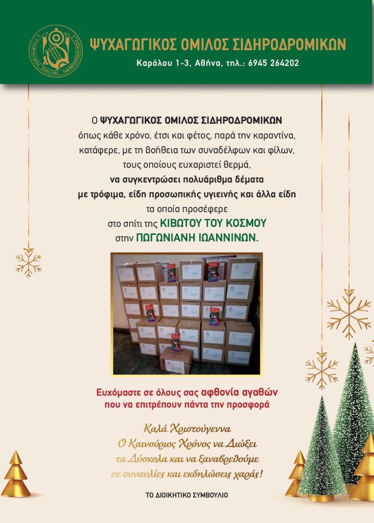 Ο ΨΥΧΑΓΩΓΙΚΟΣ ΟΜΙΛΟΣ ΣΙΔΗΡΟΔΡΟΜΙΚΩΝ όπως κάθε χρόνο. έτσι και φέτος. παρά τnν καραντίνα. κατάφερε, με τη βοήθεια των συναδέλφων και φίλων τους, οποίους ευχαριστεί θερμά, να συγκεντρώσει πολυάριθμα δέματα με τρόφιμα, είδη προσωπικής υγιεινής και άλλα είδη τα οποία προσέφερε στο σπίτι της ΚΙΒΩΤΟΥ ΤΟΥ ΚΟΣΜΟΥ στην ΠΩΓΩΝΙΑΝΗ ΙΩΑΝΝΙΝΩΝ.