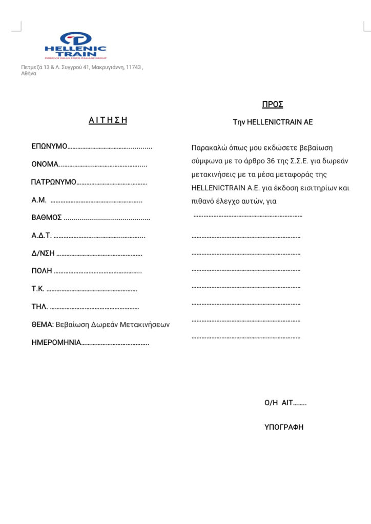 Επισυνάπτουμε την αίτηση της HELLENIC TRAIN (κάντε αριστερό κλικ)